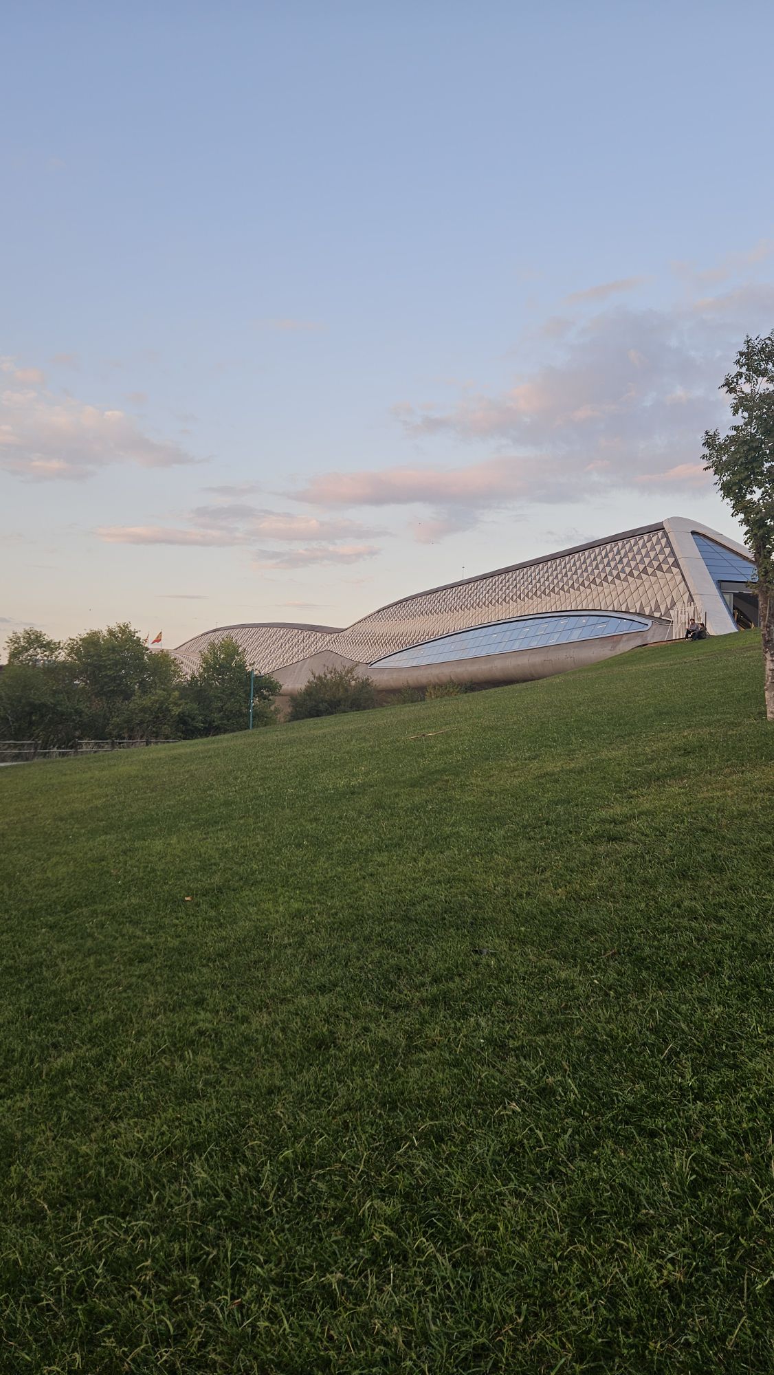 El sábado 11 de octubre, en plenas Fiestas del Pilar, fue el día elegido. Me dispuse a ir al atardecer, sobre las 19:30, cuando la luz es suave y dorada. Tomé el mismo autobús que uso cada día para ir al trabajo, pero esta vez con la mente libre de pendientes, lleno de ansiedad y expectación: iba a ver por primera vez una obra de Zaha Hadid. Elegí esa hora para apreciarla en su estado más puro, sin el contraste de las luces fuertes ni las sombras cegadoras. Quería observar su forma, su movimiento, la manera en que se integraba al paisaje, quería sentir la cotidianidad de una obra que en la universidad parecía inalcanzable, casi puesta en un pedestal.