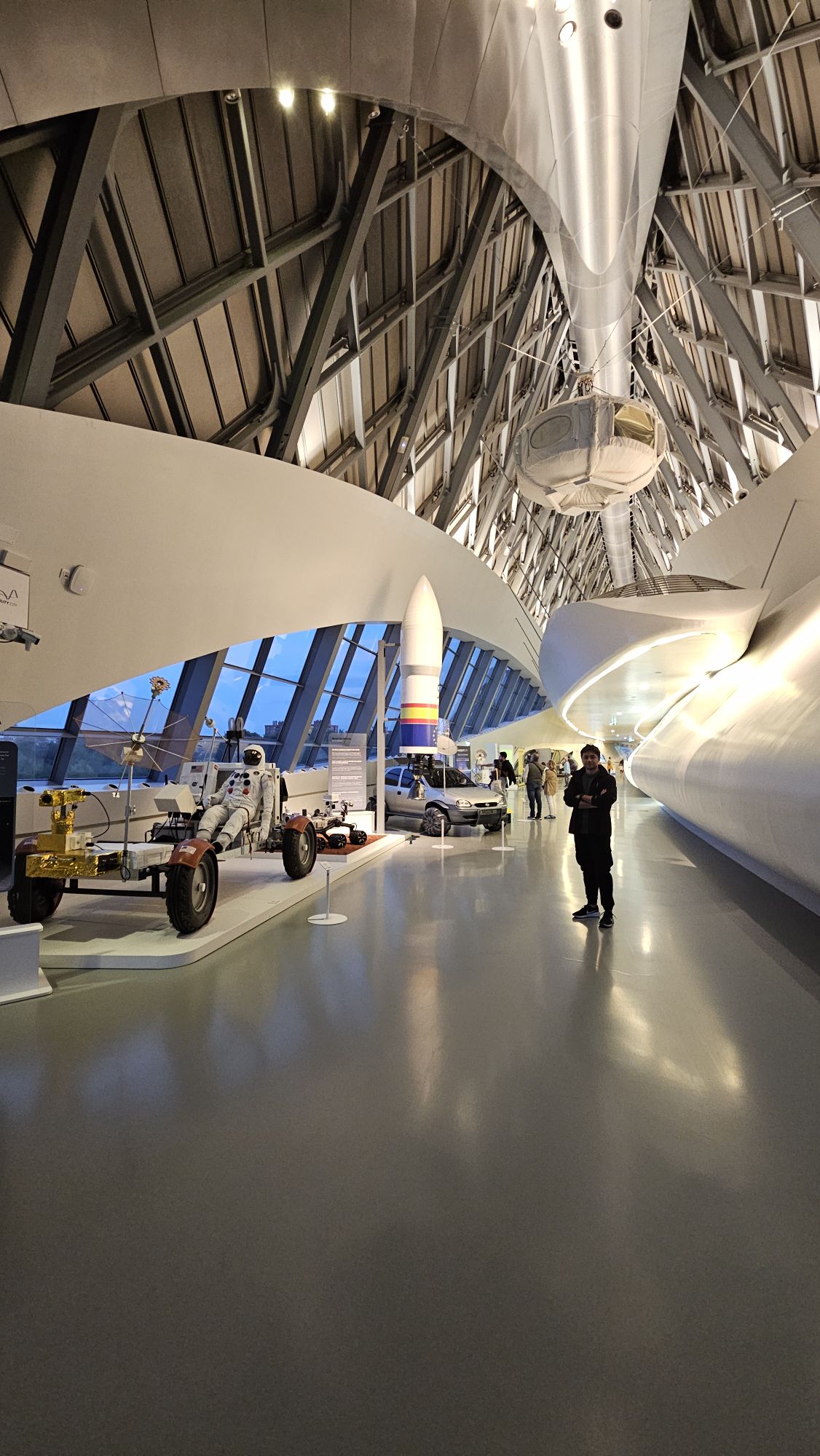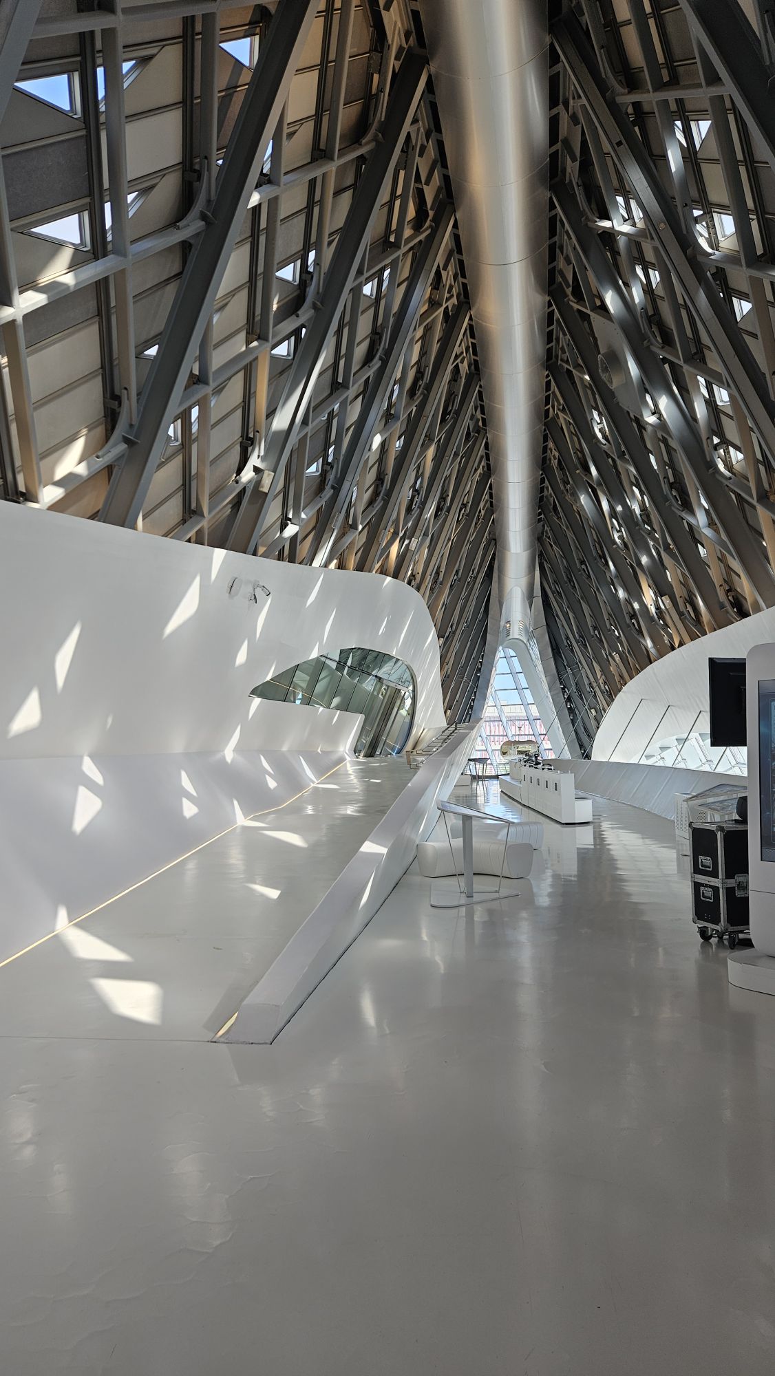 El interior se sentía como lo había imaginado: moderno, dinámico, nada convencional. Mi ojo crítico disfrutaba analizando cada detalle de una de mis grandes referentes, reconociendo lo bueno y lo no tan bueno, porque en arquitectura hay que ser honestos: cada aspecto cuenta en la experiencia del espacio. No podía creer que caminaba sobre la visión materializada de Zaha, tratando de descifrar sus intenciones, sus motivaciones, sus miedos, sus decisiones, estaba afinado y curioso, como un niño que ve el mundo por primera vez.